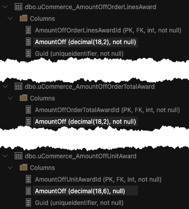 ALTER TABLE [dbo].[uCommerce_AmountOffOrderTotalAward] ALTER COLUMN AmountOff decimal(18,6);Sometimes you will need to update the `NumberOfDigitsPrecision` setting in `www/umbraco/Ucommerce/Configuration/Settings/Settings.config` and change it to `5`.